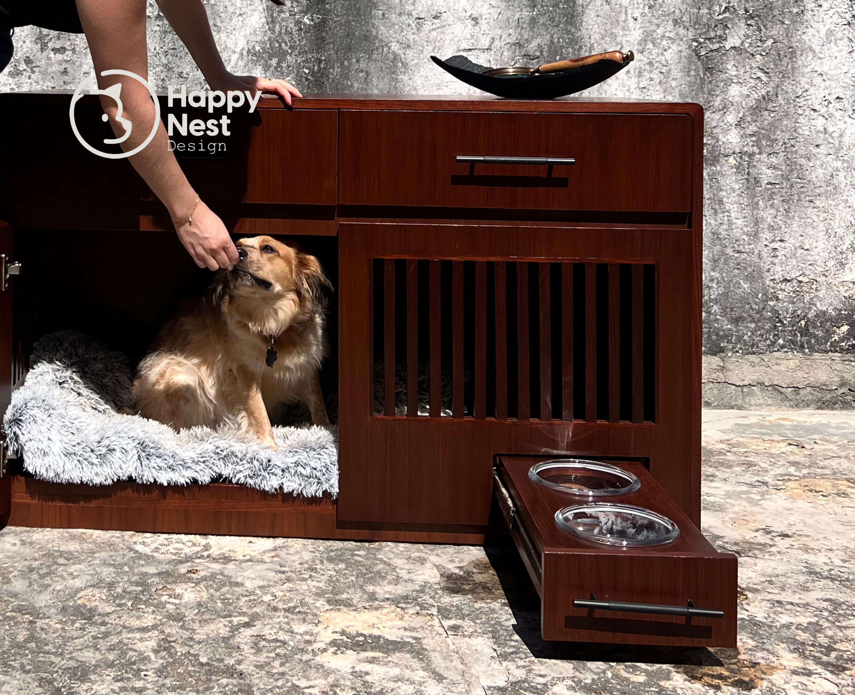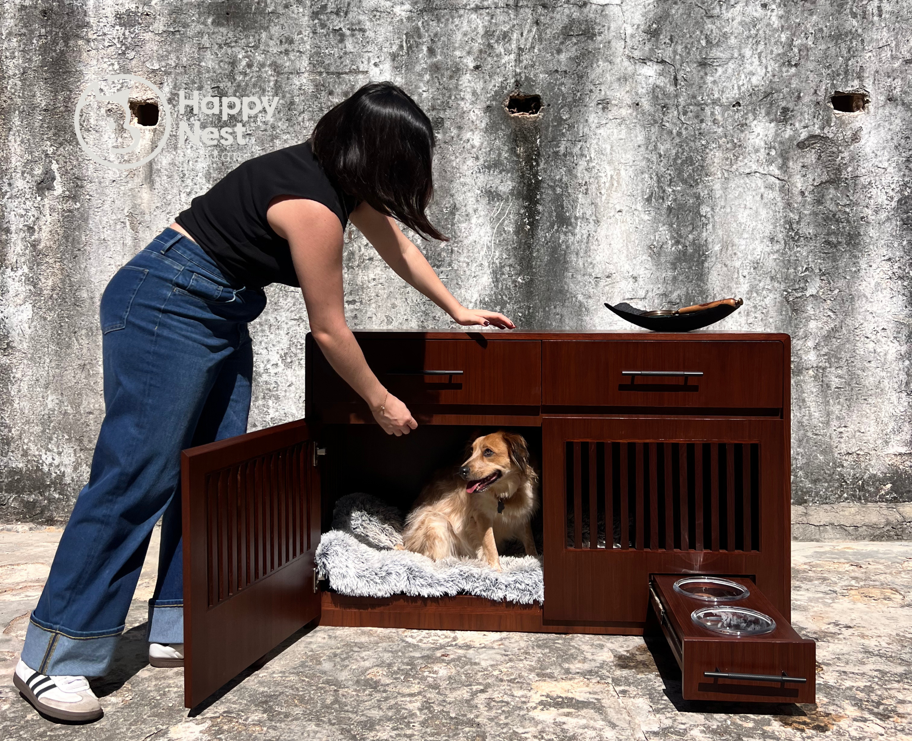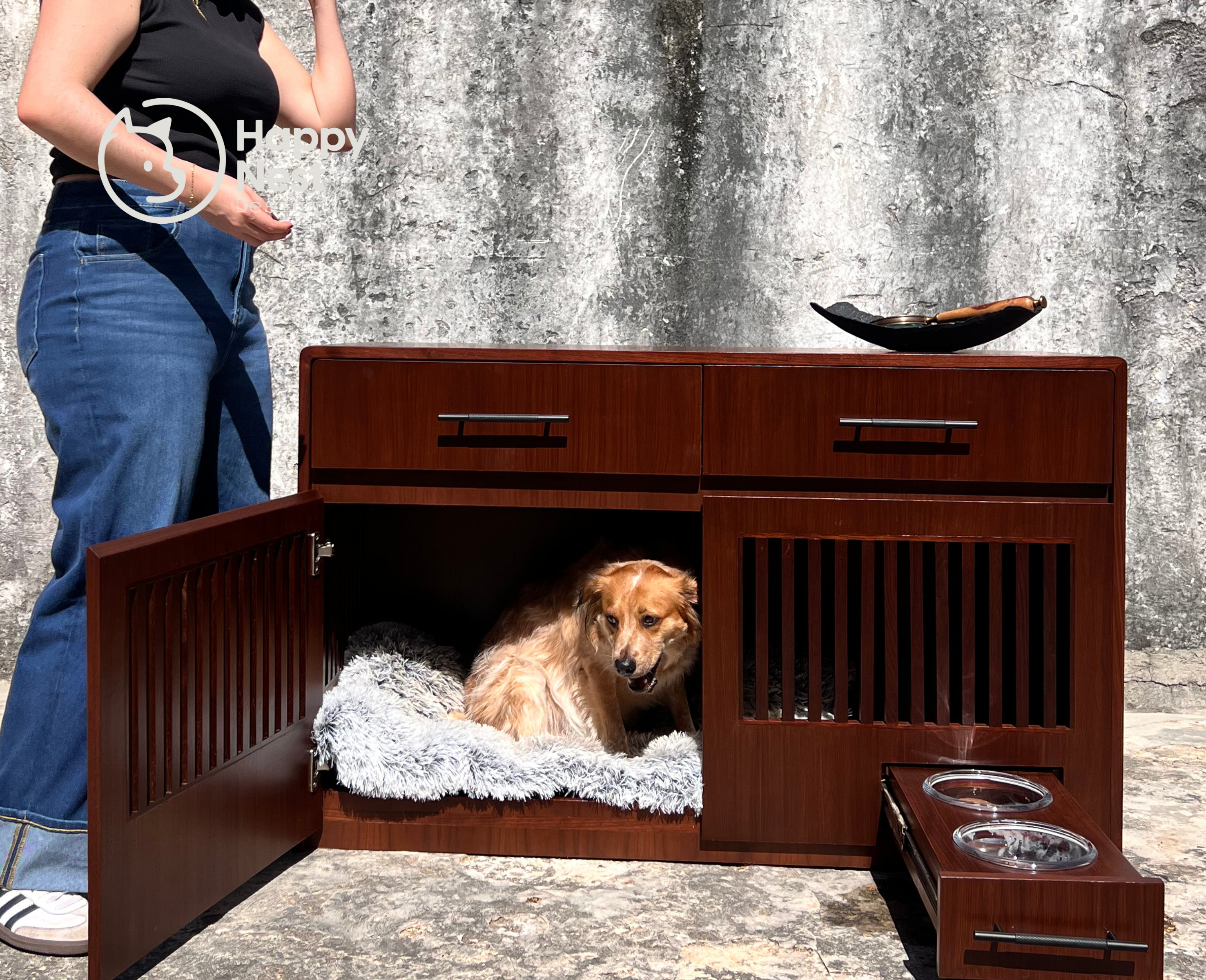 Esta pieza es el mueble perfecto que complementará tu recámara. Funciona como una cómoda o un mueble de televisión y guarida con platos ocultos para un perrito mediano o dos chiquitos. Para el humano consideramos dos cajones en la parte superior. Características: Elaborado a base de madera de nogal con...
