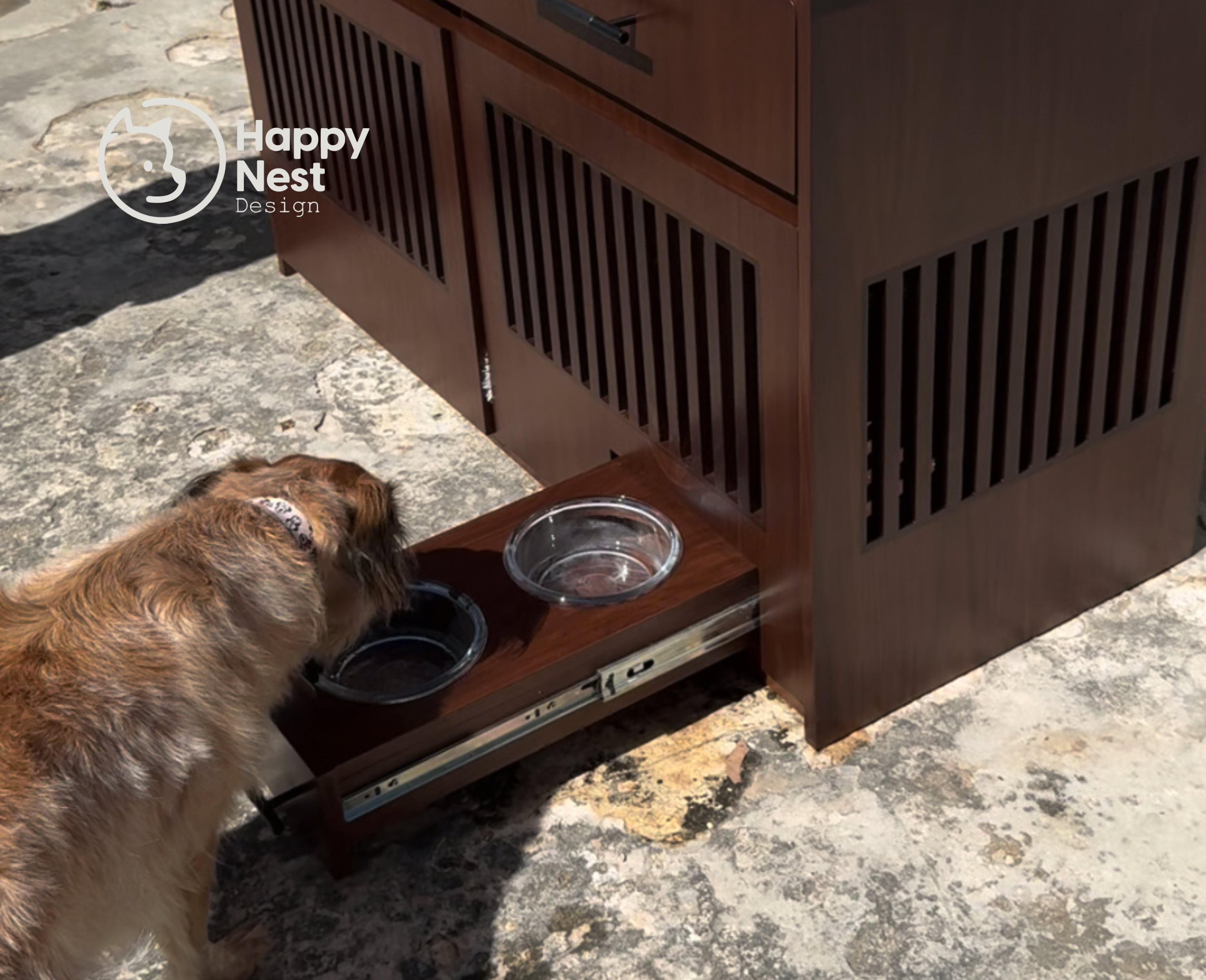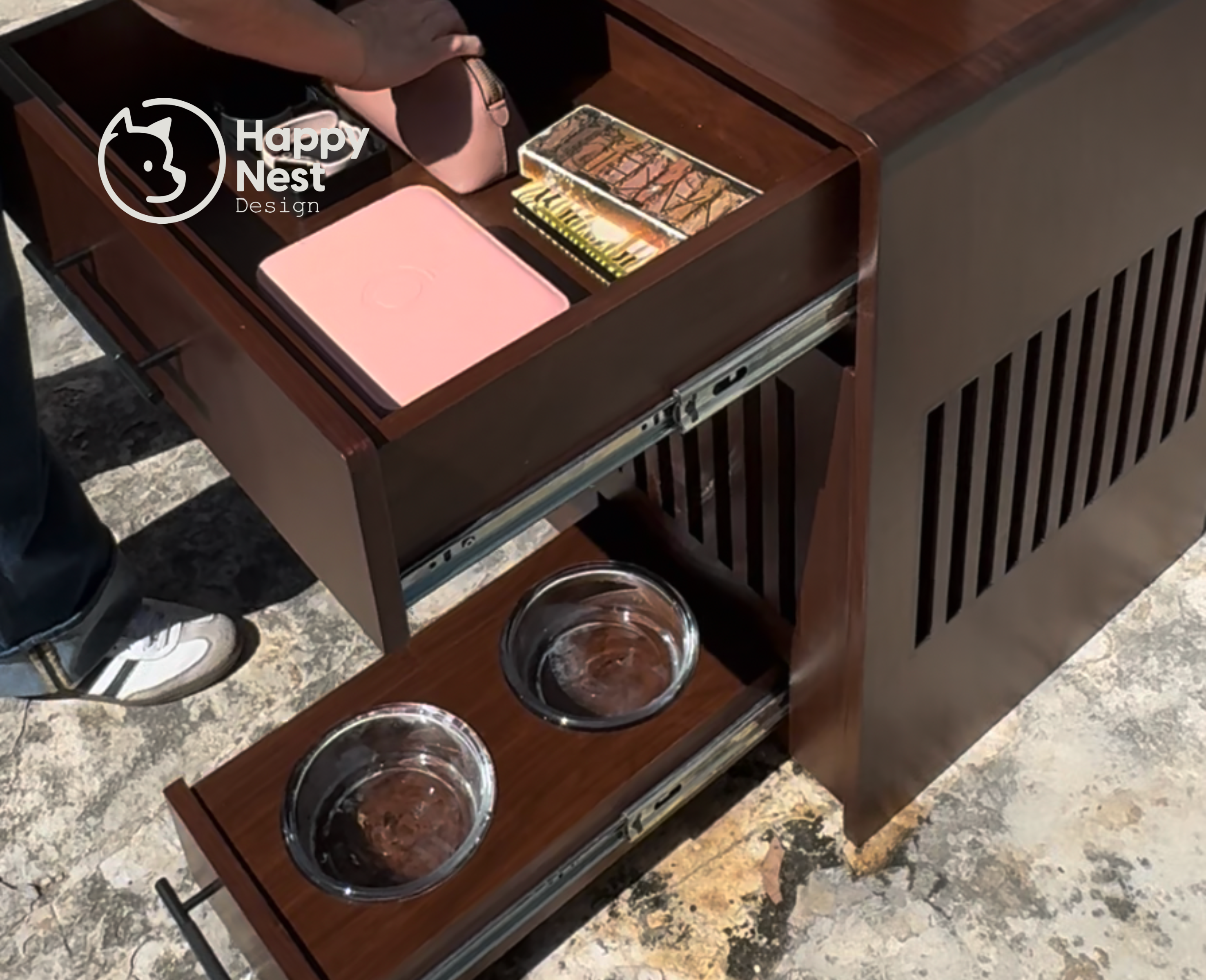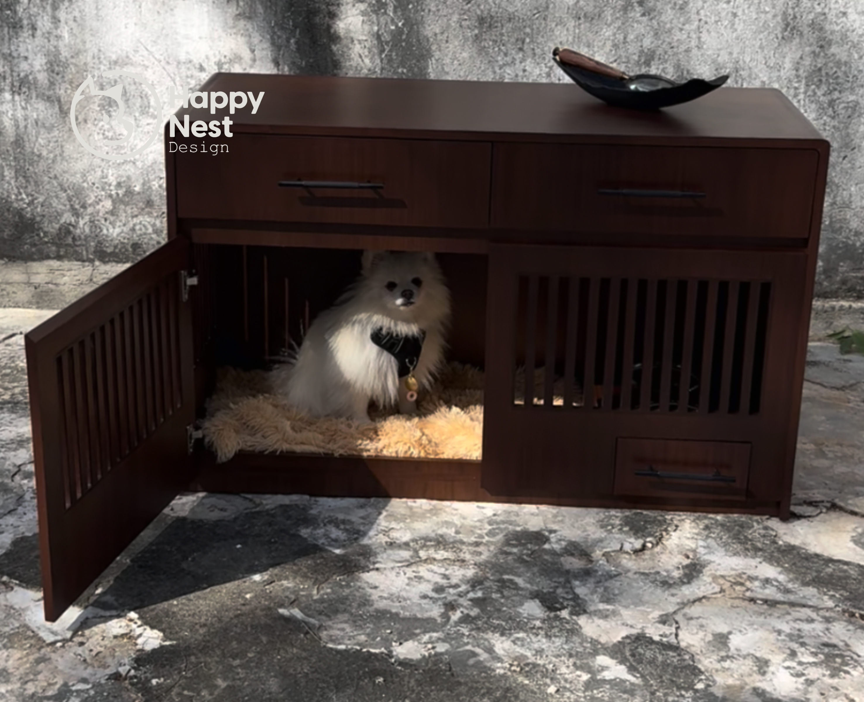 Esta pieza es el mueble perfecto que complementará tu recámara. Funciona como una cómoda o un mueble de televisión y guarida con platos ocultos para un perrito mediano o dos chiquitos. Para el humano consideramos dos cajones en la parte superior. Características: Elaborado a base de madera de nogal con...